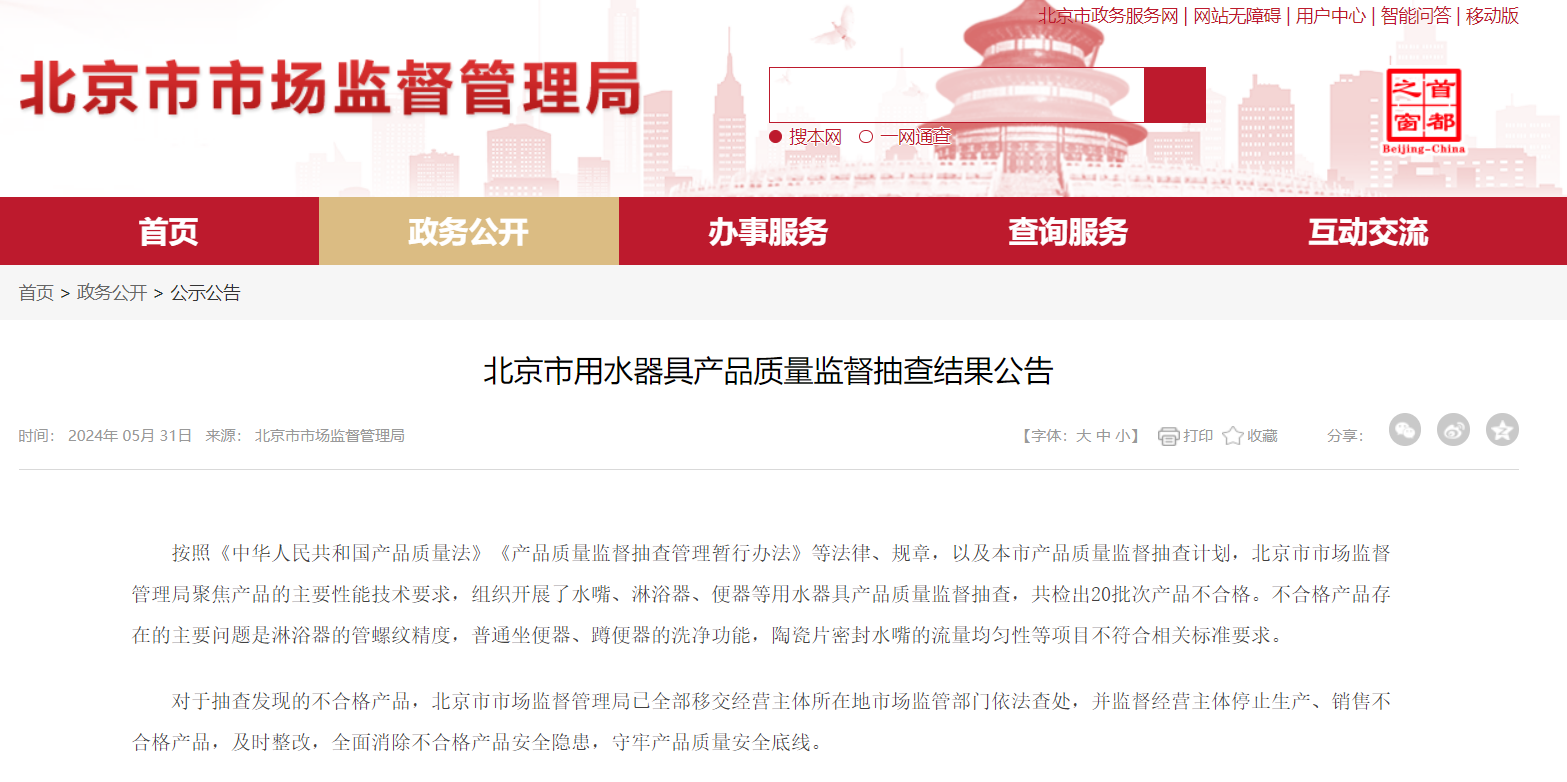 乐居财经 邓如菲 近日,北京市市场监督管理局发布用水器具产品质量监督抽查结果公告,通报20批次用水器具产品不合格。